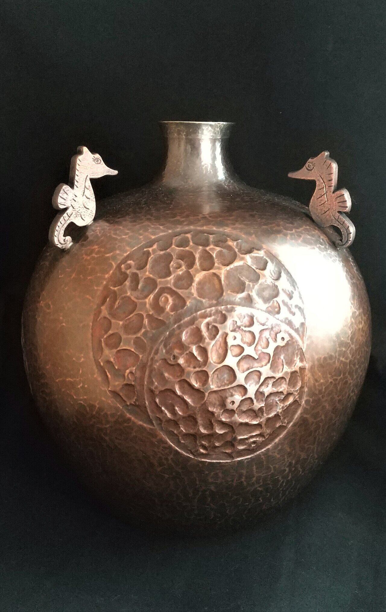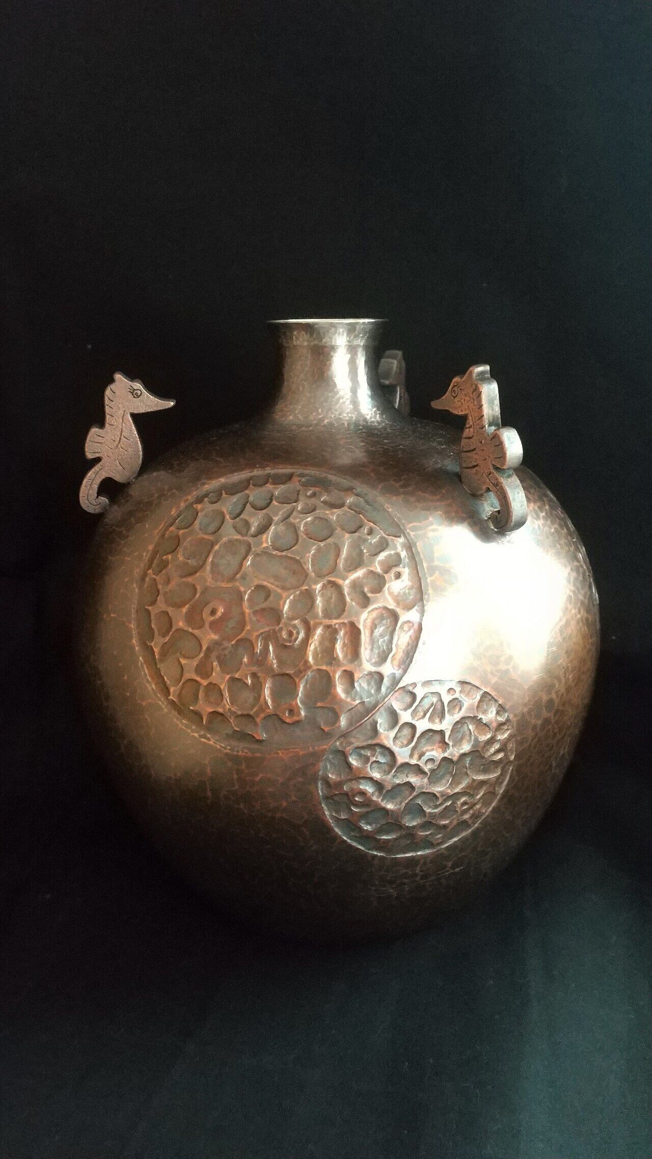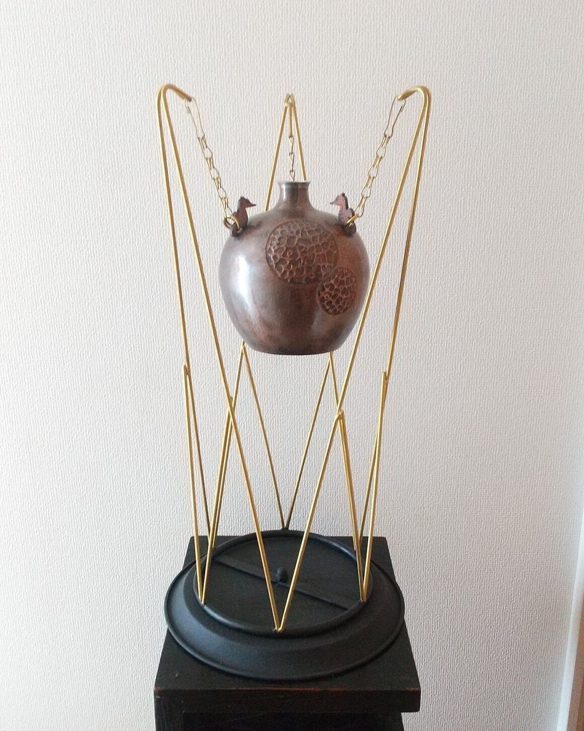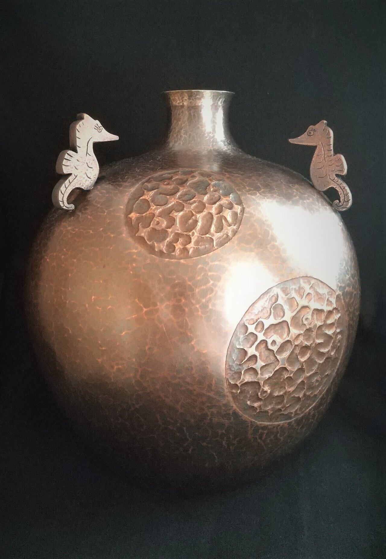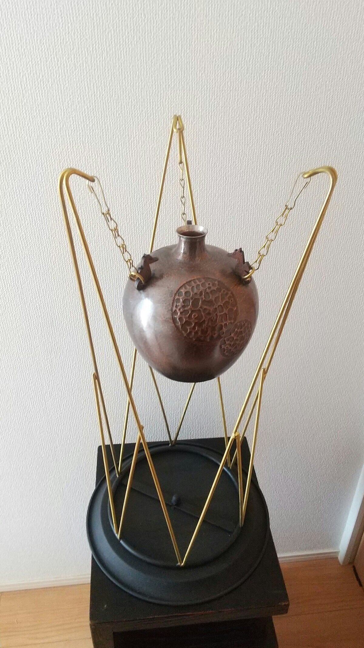 純銅を金槌で絞った壺と鉄製台です。口の部分には純銀を溶接しています。