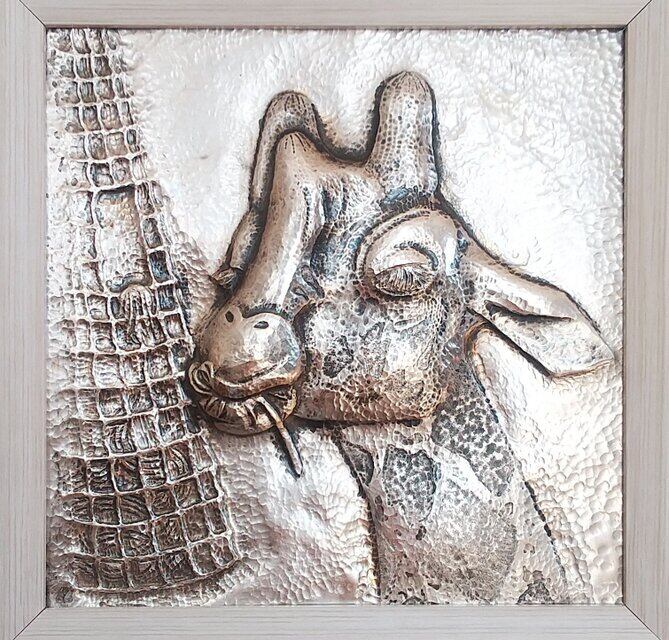 ・制作過程 : 純銀板を鈍し、鏨(たがね)を用いて少しずつキリンの姿形や模様が浮き出る様に打ち込みながら制作しました。