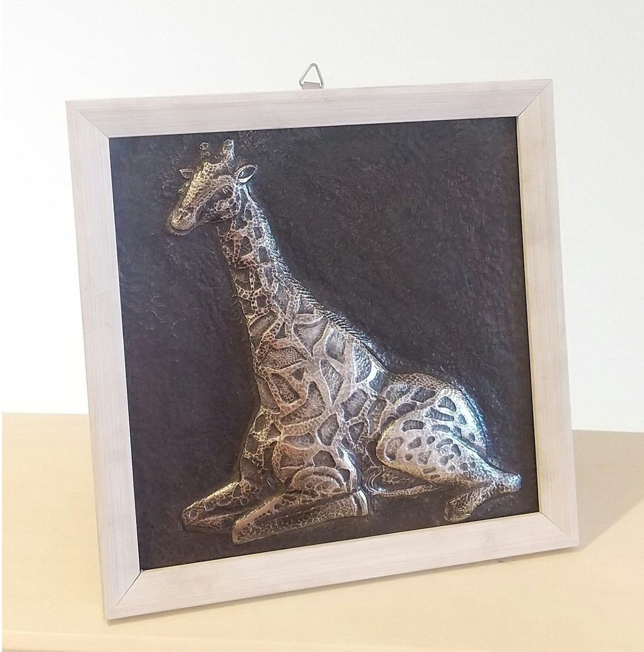 ・制作過程 : 純銀板を鈍し、鏨(たがね)を用いて少しずつキリンの姿形や模様が浮き出る様に打ち込みながら制作しました。